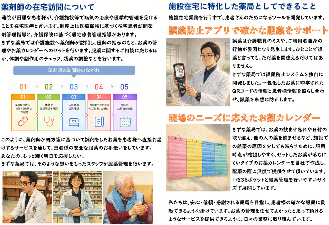 当薬局では独⾃に開発した「きずな誤薬防⽌システム」をご施設様へ無償で提供、